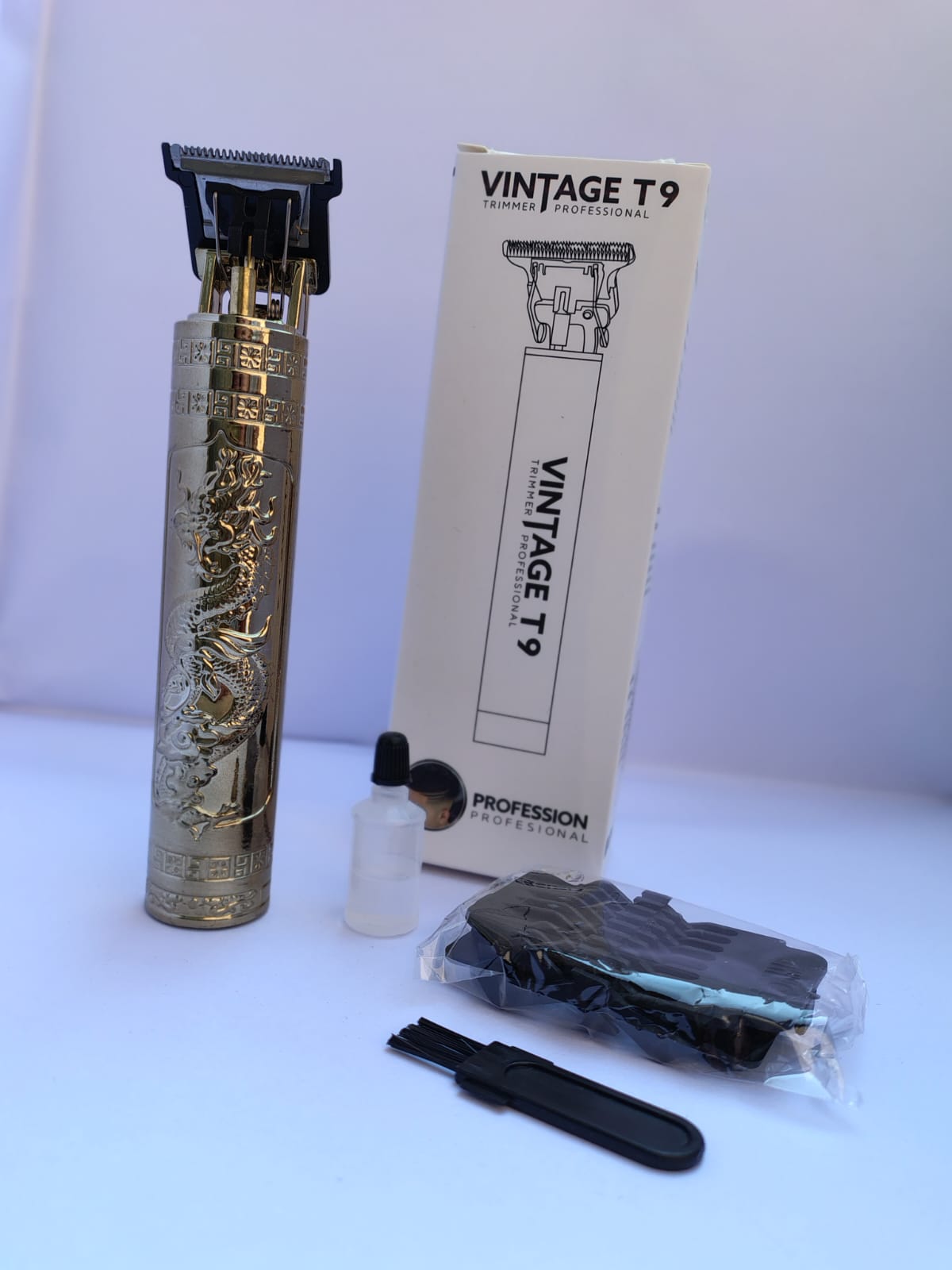 La Vintage T9 Trimmer Profesional es ideal para barberos y uso personal. Ofrece cortes precisos, contornos definidos y un diseño elegante tipo vintage con grabado metálico.